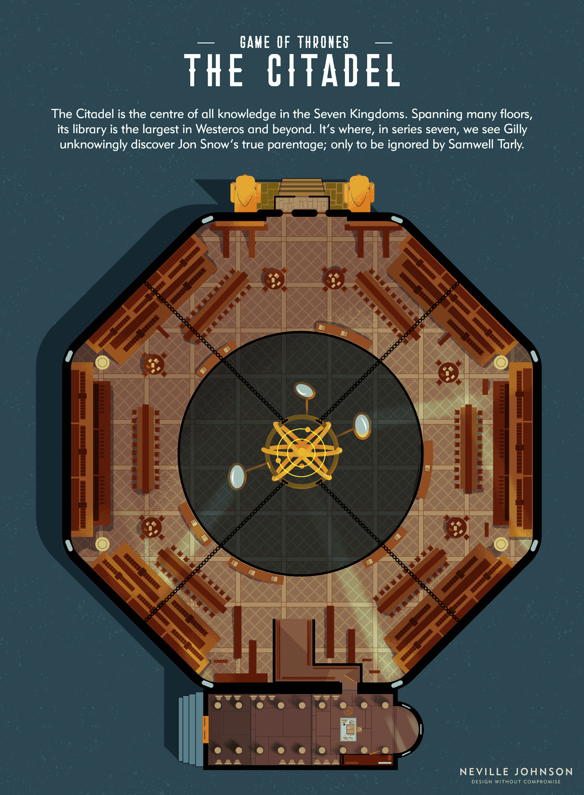 As the centre for all scientific, medical and historical knowledge in the Seven Kingdoms, it's no surprise the Citadel's library is grand and imposing. Set around an ornate, octagonal room; a variety of ancient architectural styles are on show - including Roman, Egyptian, Mayan, Moorish, Greek, Germanic and Indian features. Staircases wind their way up as many as thirteen stories of bookshelves, separated by Roman arches, while stained-glass windows let in a low, atmospheric light from each corner.