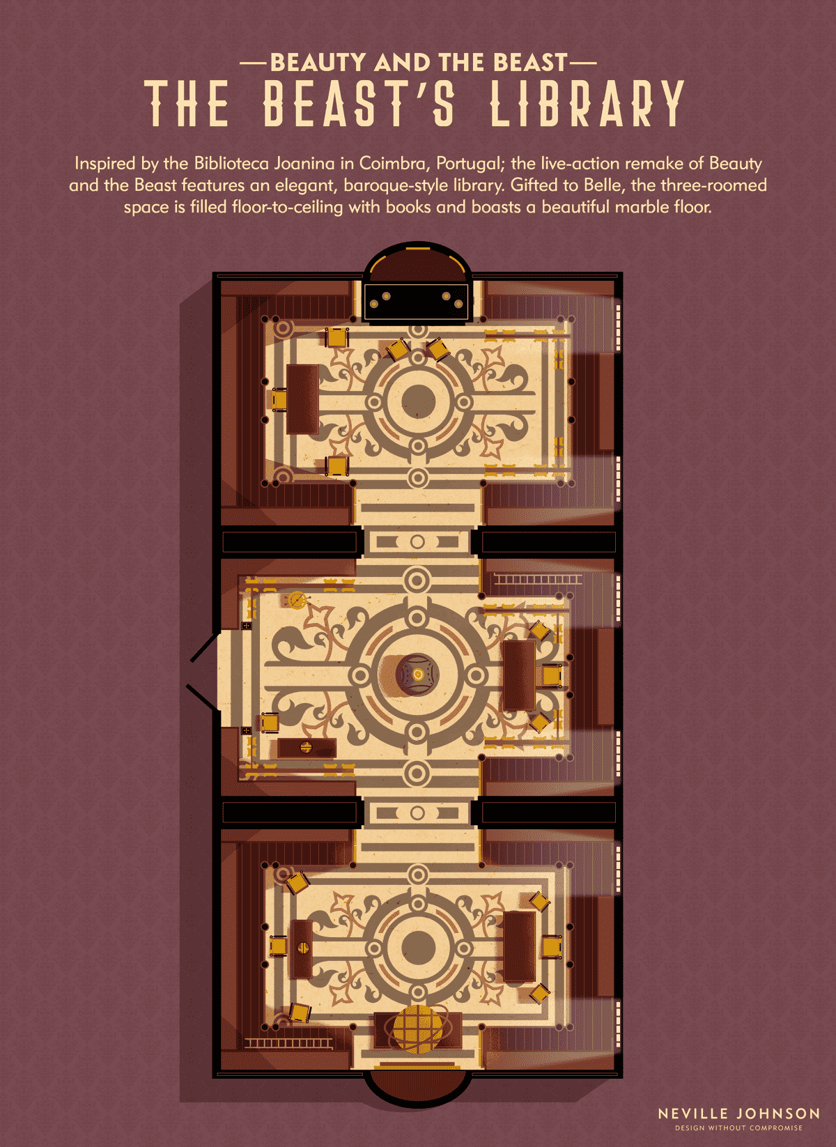 A triple-cube library built in the baroque style, this spectacular and elegant space was given as a gift to Belle by The Beast. The recent live-action remake sought the Biblioteca Joanina in Coimbra, Portugal as its inspiration, reflecting its segmented design and decorative arches.