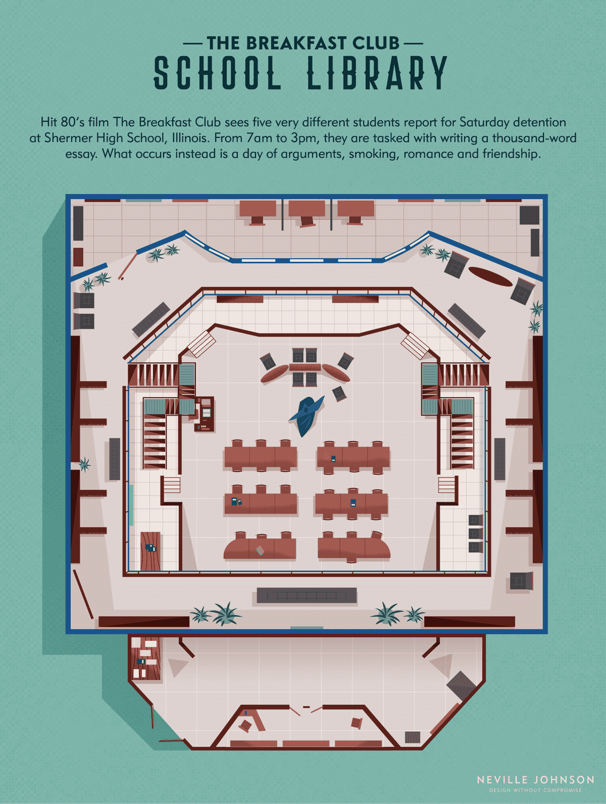 The thoroughly-modern Shermer School Library is where the five protagonists of 80s coming-of-age film 'The Breakfast Club' are asked to report for detention at 7am, one Saturday morning. Despite the five hailing from very different cliques, what follows is a morning of self-discovery and new-found friendship, all from inside the library's four walls.